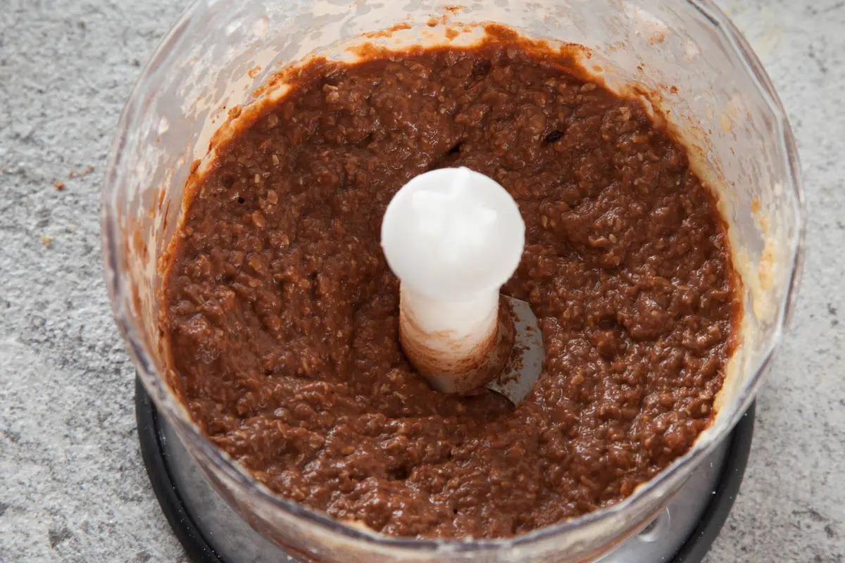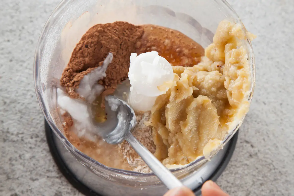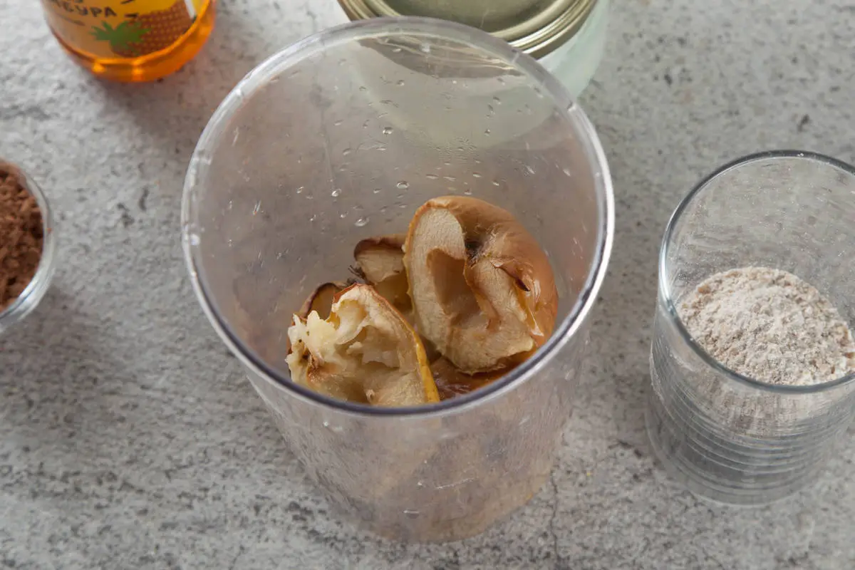 Овсяные хлопья измельчить в блендере, добавить в чашу какао-порошок, сироп, масло и яблочное пюре.