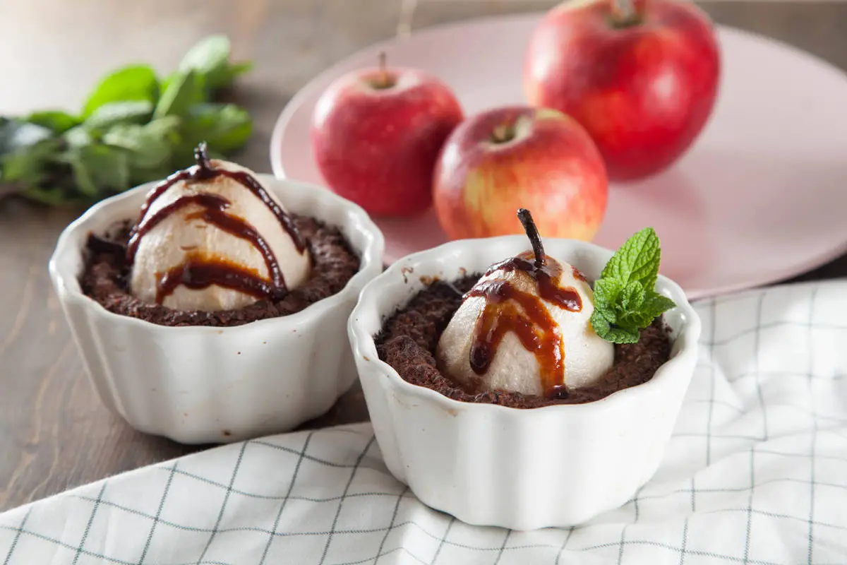 Груши очистите от кожуры и сбрызните лимонным соком, чтобы они не потемнели. Распределите тесто по формам, в середину воткните грушу. До края формы должно оставаться хотя бы 1 см – десерт немного поднимется при выпекании.