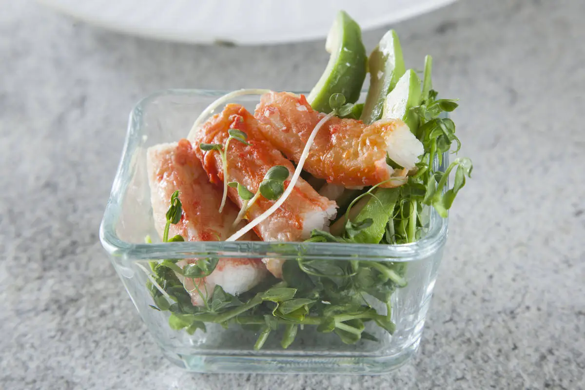 Выложите микрозелень на тарелки, сверху крабов и авокадо, полейте заправкой. Приятного аппетита!