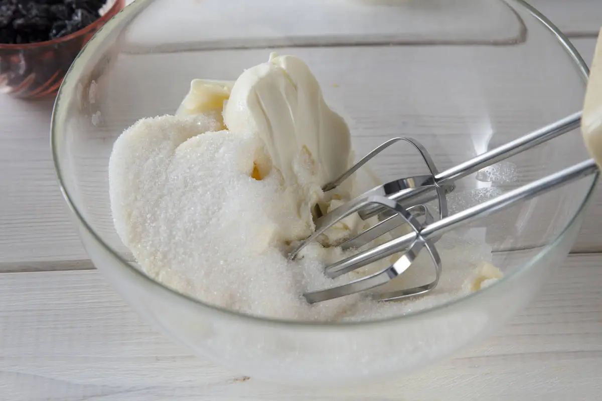 Духовку разогрейте до 170 градусов. Масло соедините с 100 г сахара и взбейте добела, проследите, чтобы кристаллики сахара растворились.