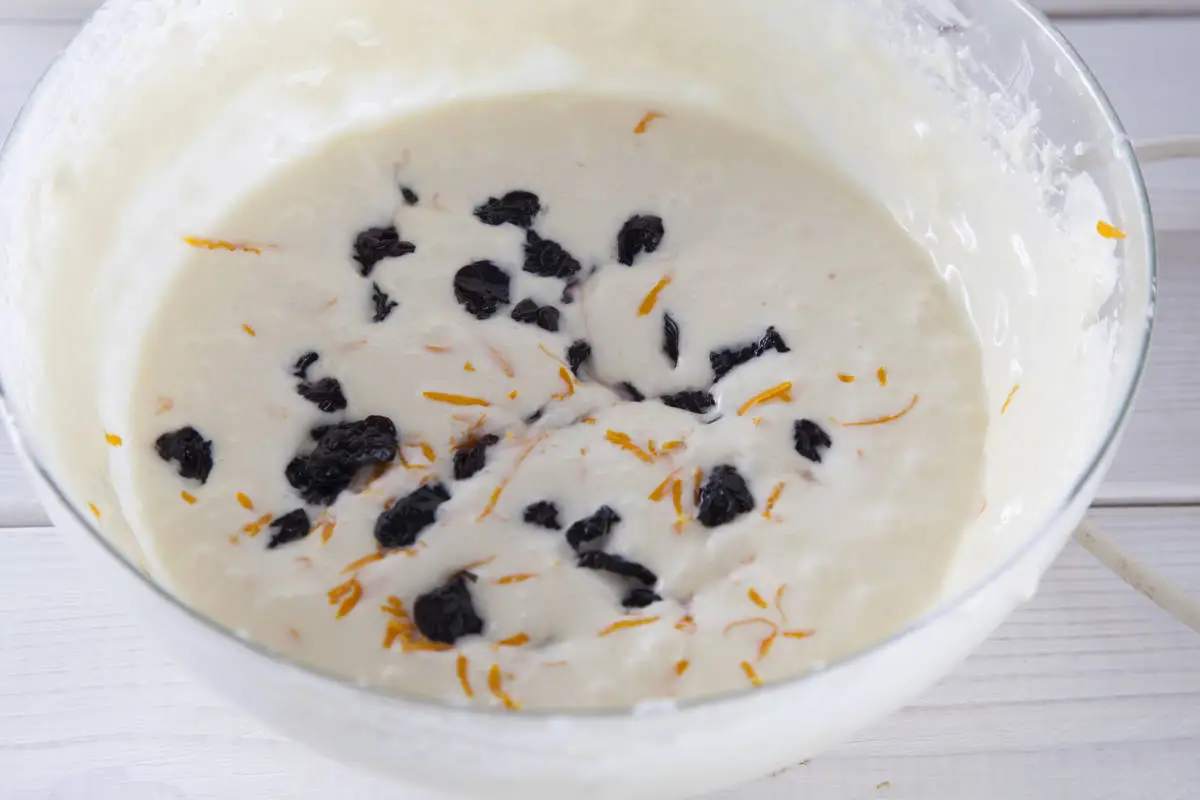 Сок вылейте в яичную массу и тщательно взбейте, затем добавьте цедру и вяленую вишню.