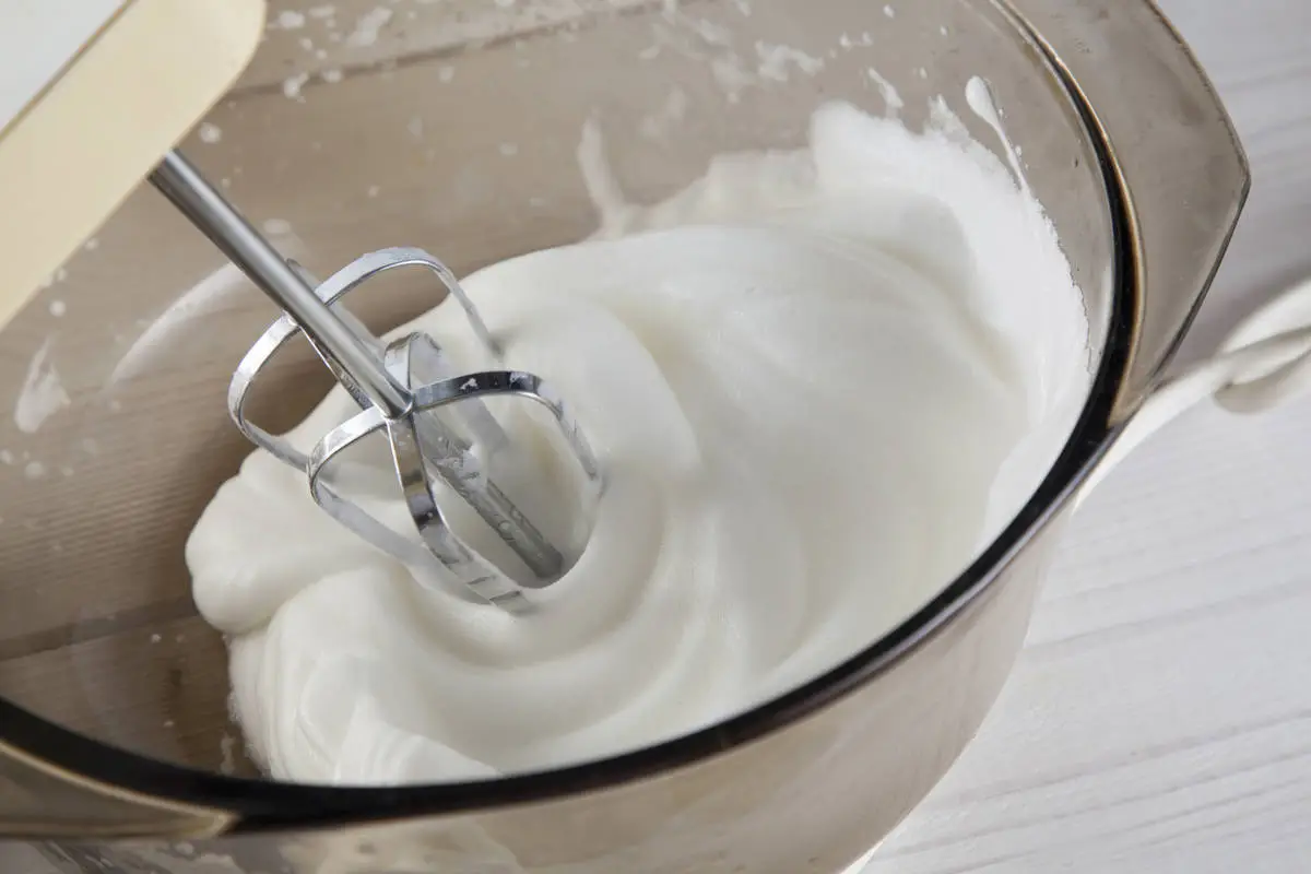 Вымойте и вытрите насухо венчики миксера и посуду для взбивания. Белки взбейте на максимальной мощности миксера до мягких пиков, добавьте сахар и взбивайте еще минуту до блеска.