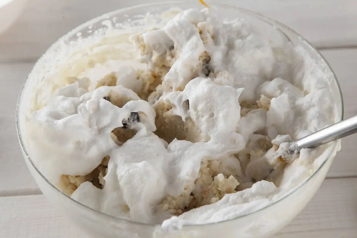 Аккуратными движениями ложки вмешайте белки в тесто, размешивать до однородности не нужно.