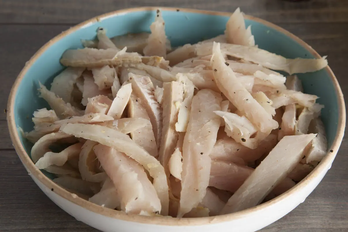 Заранее размороженную рыбу нарежьте небольшими продолговатыми кусочками и замаринуйте в смеси на 10 минут.
