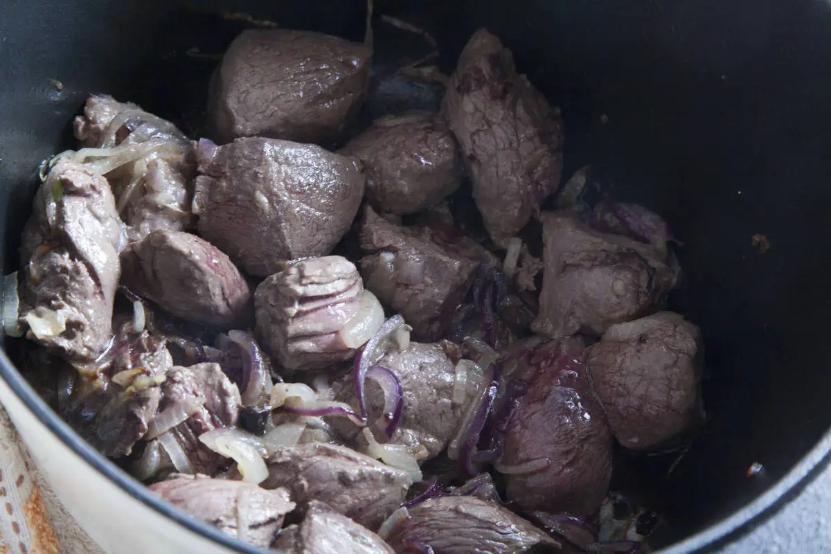 В кастрюле для тушения разогрейте масло и обжарьте оленину до золотистой корочки, добавьте лук и жарьте еще минуту, затем влейте вино, дайте ему выпариться.