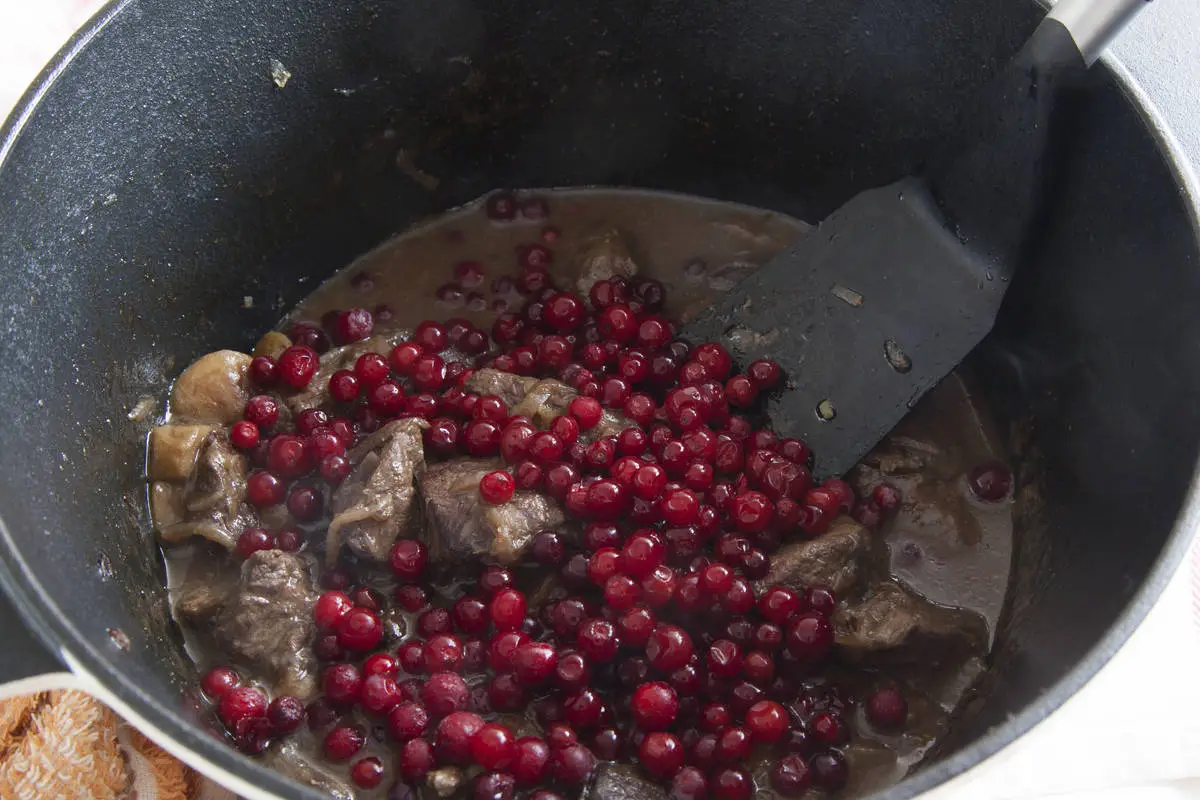 Грибы отварите в течение 10-15ти минут, промойте и добавьте к оленине, тушите еще 20 минут. В конце добавьте замороженную бруснику и готовьте еще 5 минут. Дайте готовому блюду немного настояться и подавайте!