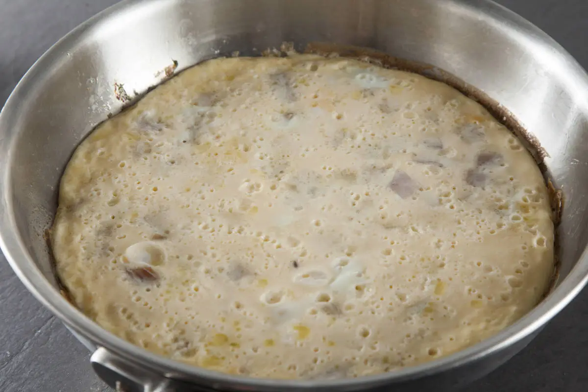 Яйца взбейте с солью и сливками в пену, добавьте порезанную кубиками ветчину.