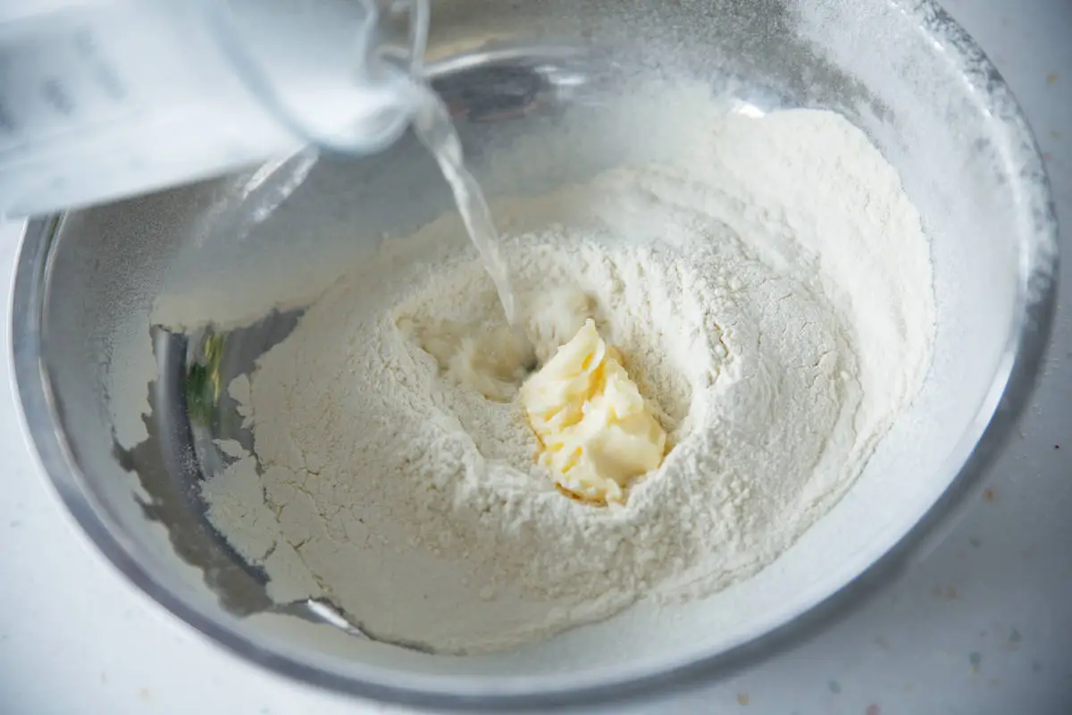 200 г муки просейте в большую миску. Сделайте в центре углубление, добавьте соль и растопленное сливочное масло, влейте теплую воду — столько, чтобы получилось эластичное тесто.