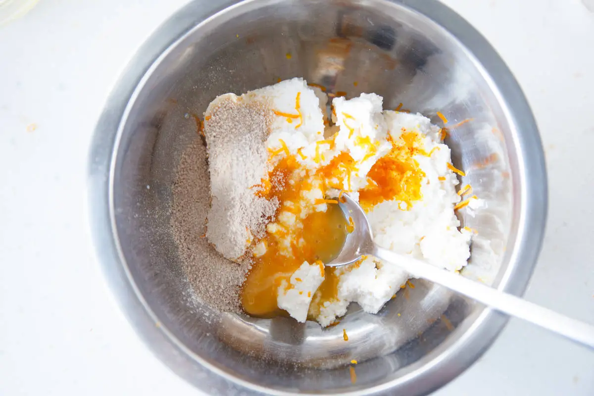 Рикотту смешайте с сахаром, яйцом, оставшейся мукой и разрыхлителем, добавьте цедру, всё перемешайте.