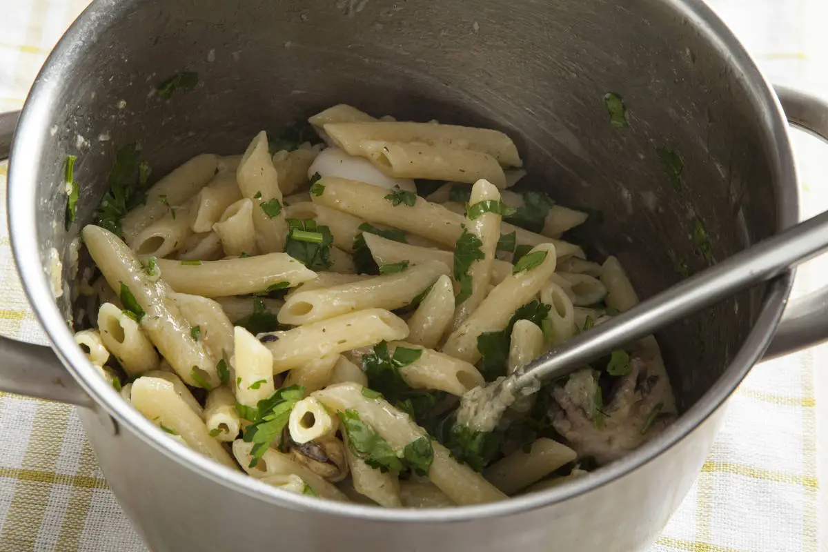 Слейте воду с готовой пасты, быстро добавьте морепродукты, чеснок и сыр, полейте маслом, хорошо перемешайте. Подавайте, посыпав петрушкой.