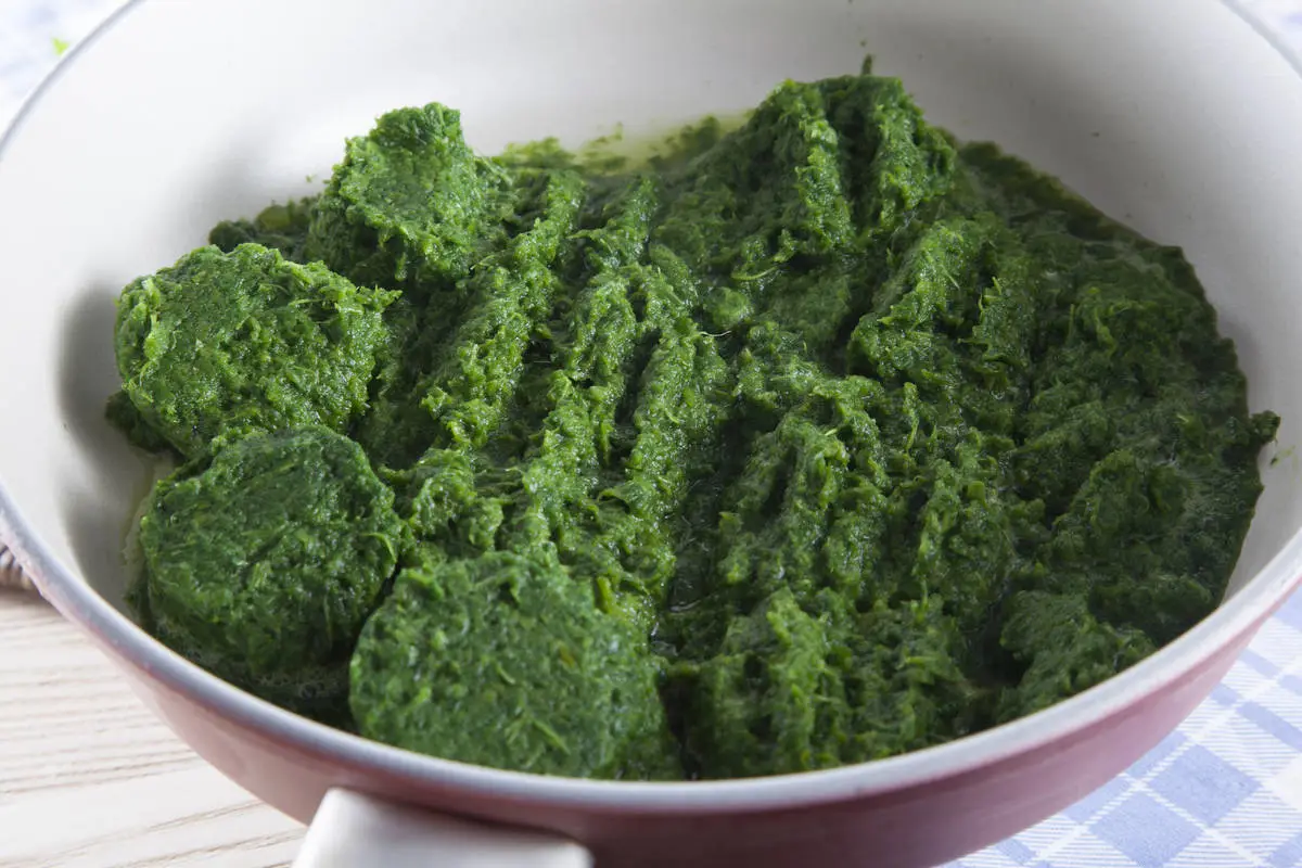 Шпинат разморозьте (можно сделать это на сковороде), выложите на дуршлаг и дайте стечь лишней жидкости.