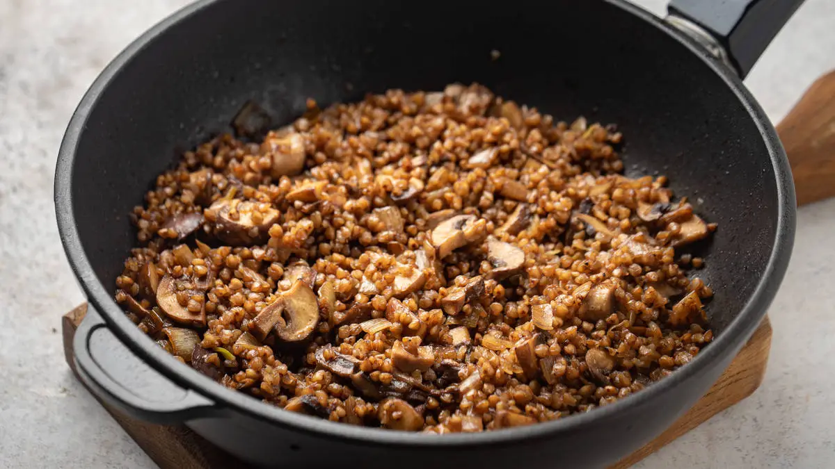 Тем временем на подсолнечном масле обжарьте измельченный лук, добавьте нарезанные дольками шампиньоны и соевый соус, обжаривайте, помешивая, до готовности грибов (8-10 минут). Добавьте в сковороду гречку и ещё немного обжарьте всё вместе. Щедро приправьте чёрным перцем и добавьте соли, если нужно. Если гречка не до конца готова, добавьте в сковороду воды и доведите до готовности. Гречка не должна развариться в кашу, а остаться слегка упругой.