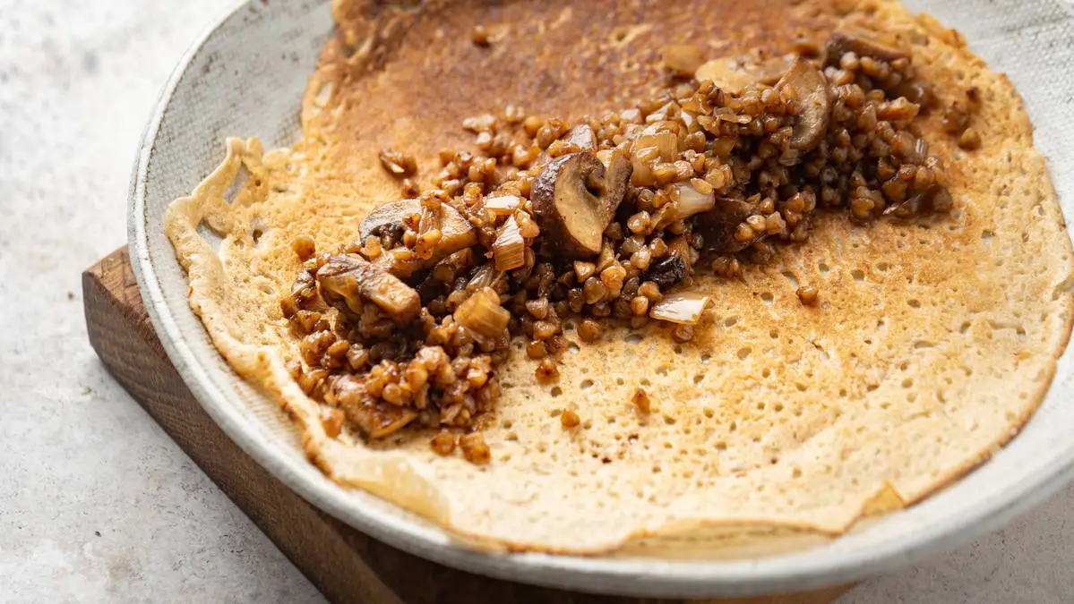 Постные блины из цельнозерновой муки с гречкой и грибами