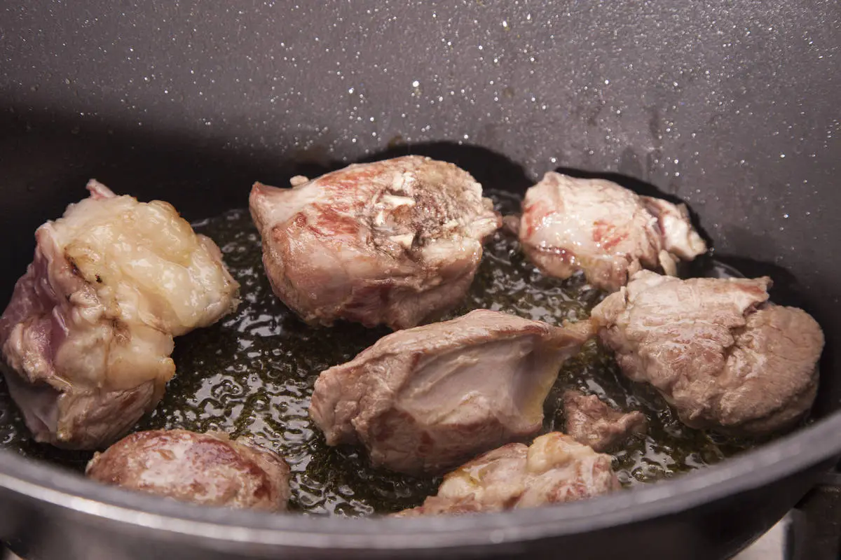 Баранину порежьте небольшими кусками, обжарьте порциями в горячем оливковом масле до румяной корочки и выложите на тарелку.
