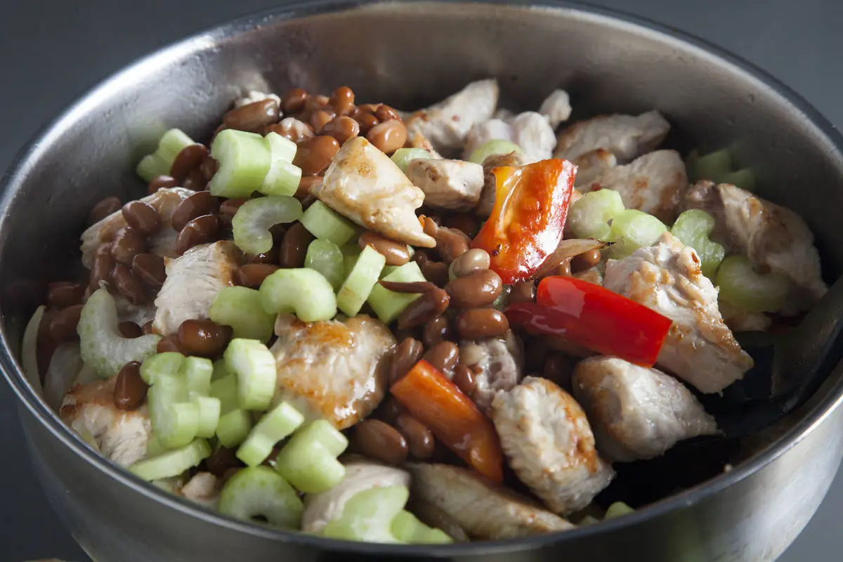 Выложите в сковороду индейку, фасоль и сельдерей, влейте немного воды, накройте крышкой и тушите на слабом огне около 15-ти минут. Приятного аппетита!