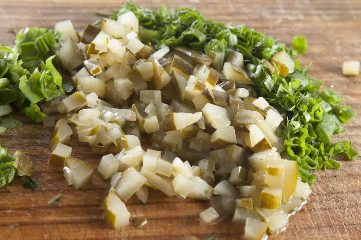 Хрустящий соленый или маринованный огурчик мелко порежьте, укроп и лук порубите.