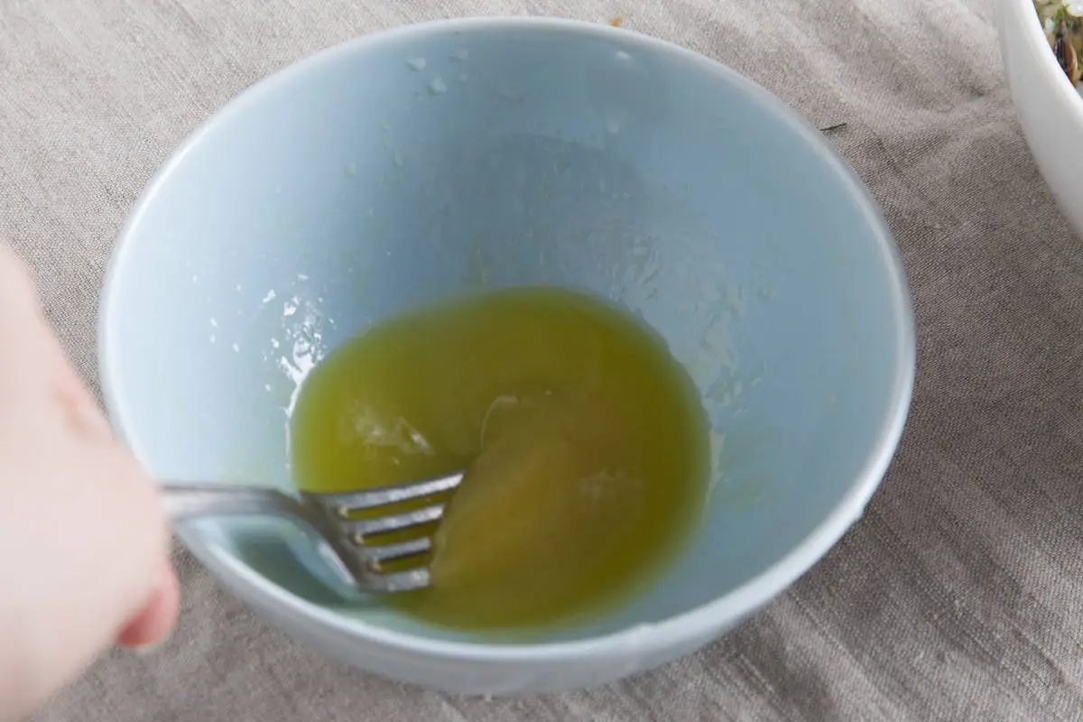 Оливковое масло смешайте с медом и лимонным соком, взбейте вилкой.