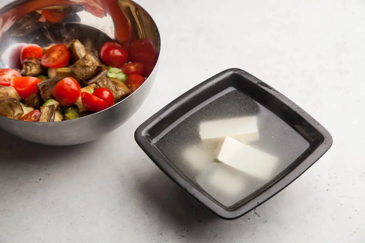 Нарежьте сыр халумис и залейте кипятком, чтобы убрать лишнюю соль и сделать сыр мягче.
