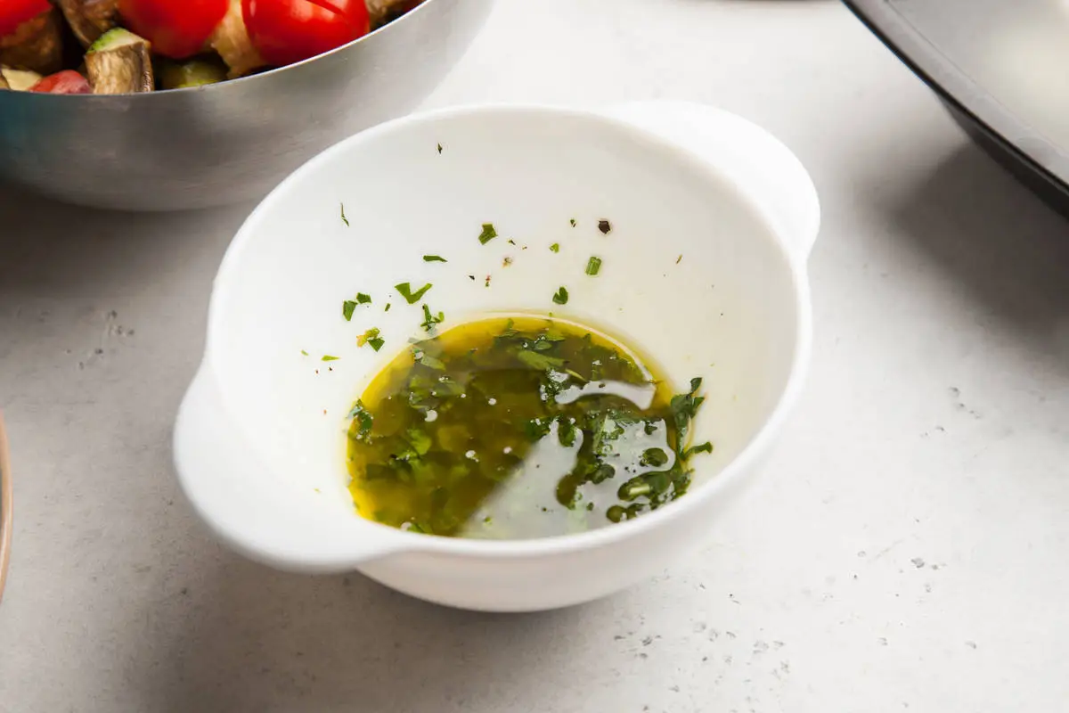 Для заправки зелень мелко нарежьте и смешайте с остальными ингредиентами.