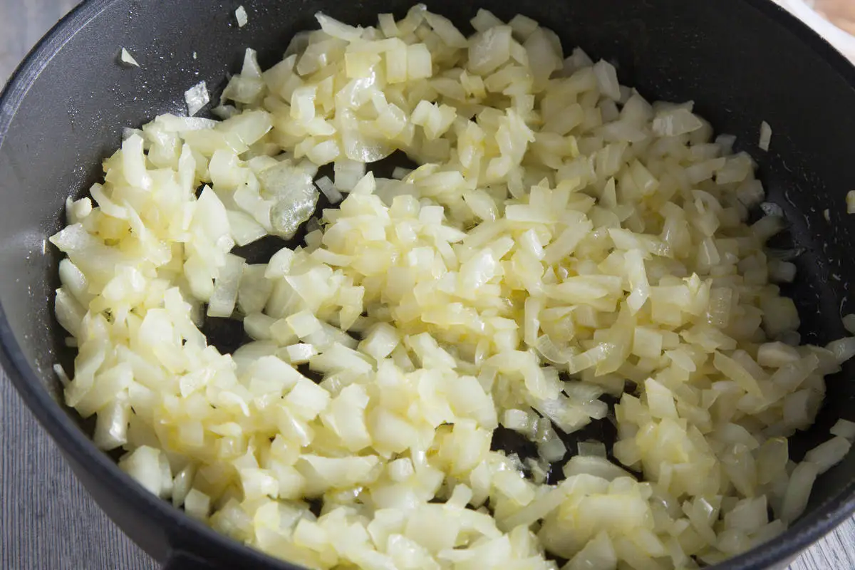 Лук мелко порежьте и обжарьте на сковороде на растительном масле, часто помешивая, до прозрачности.