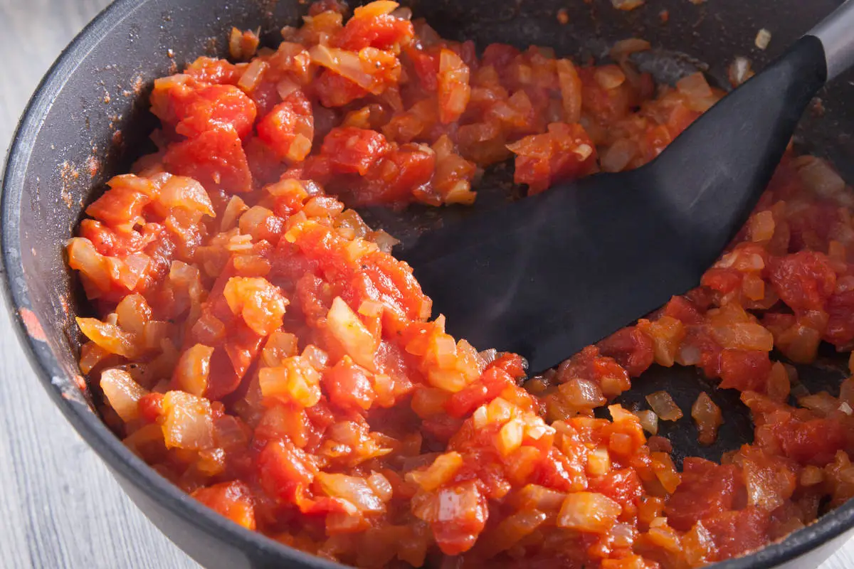 Откройте банку томатов, вылейте в сковороду к луку, обжаривайте на небольшом огне еще 10 минут.