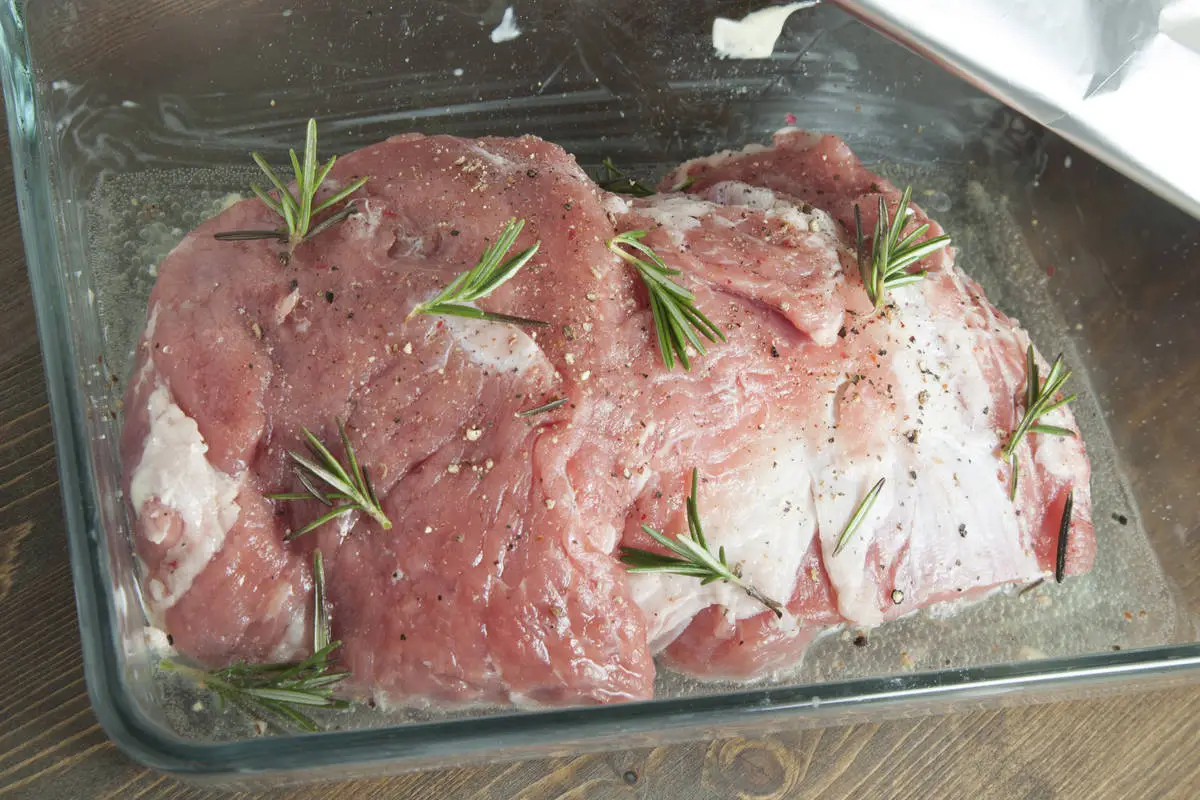 Духовку разогрейте до 180 градусов. Свинину натрите солью и перцем, выложите в смазанную сливочным маслом форму для запекания, добавьте веточки розмарина.