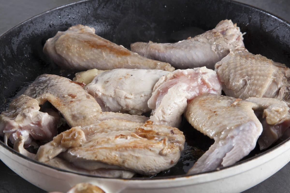 Предварительно размороженную цесарку разрежьте на порционные куски, обсушите, быстро обжарьте на горячей сковороде в оливковом масле до аппетитной корочки и выложите на тарелку.