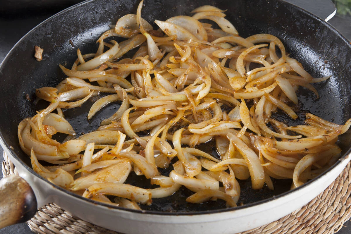 Луковицу нарежьте перьями и обжарьте в оставшемся от цесарки масле, добавив специи.