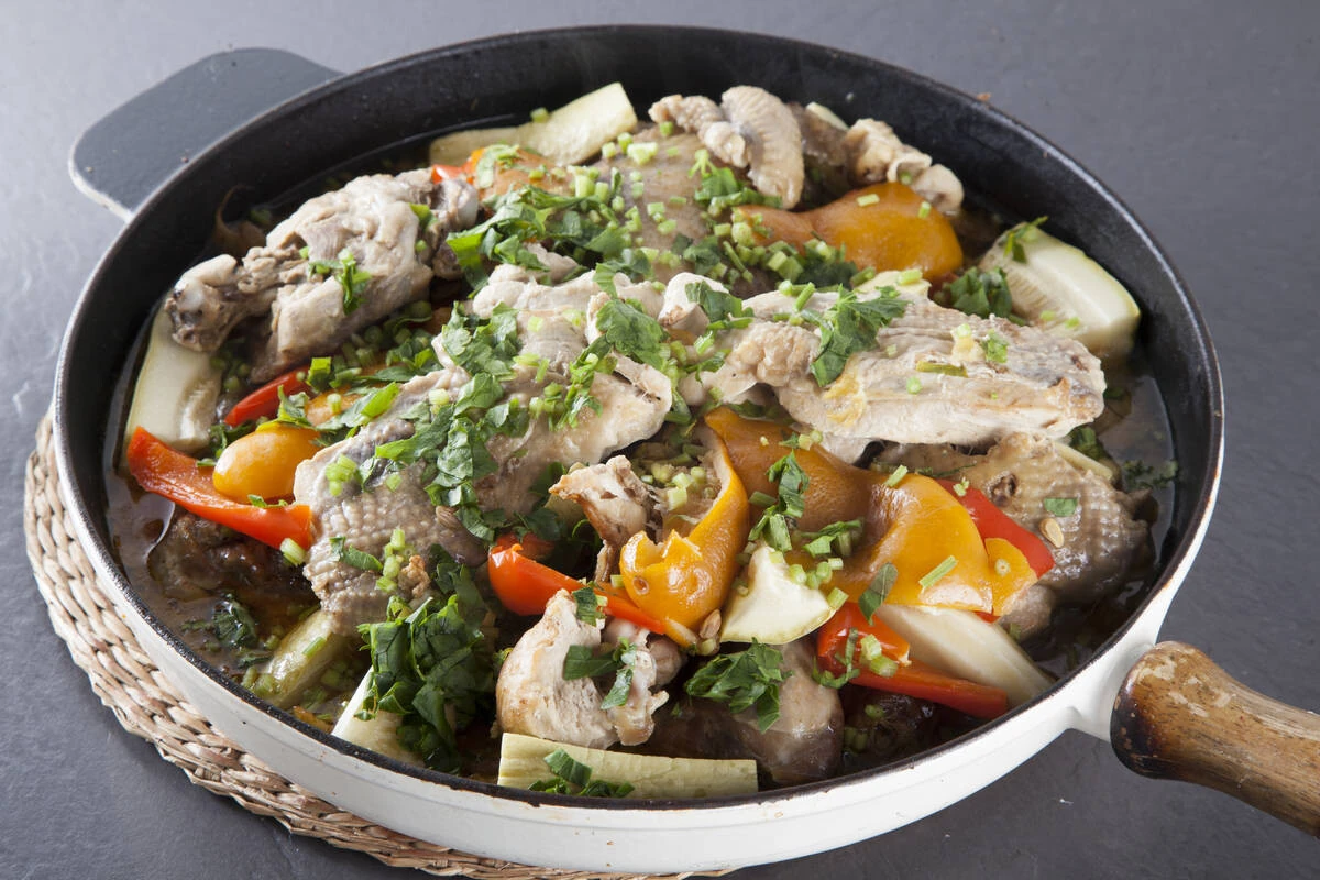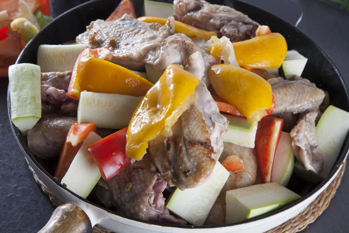 Кабачок, баклажан и болгарский перец нарежьте толстыми брусочками. Выложите в сковороду с луком куски цесарки, перемежая с овощами, вниз кладите ножки и бедра, а на самый верх грудку. Добавьте половину петрушки и соленый лимон, разделив его на 4 части, если у вас нет соленых лимонов. Используйте цедру обычного и столовую ложку сока. Накройте сковороду крышкой и тушите цесарку на медленном огне около часа-полутора до мягкости.