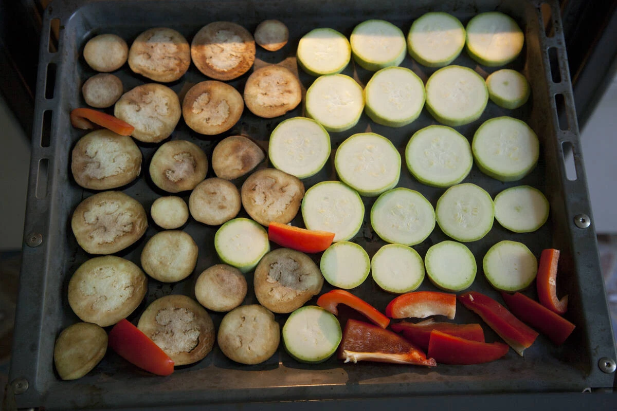 Оставшиеся баклажан и кабачок нарежьте кружочками и запеките в духовке под грилем до готовности.