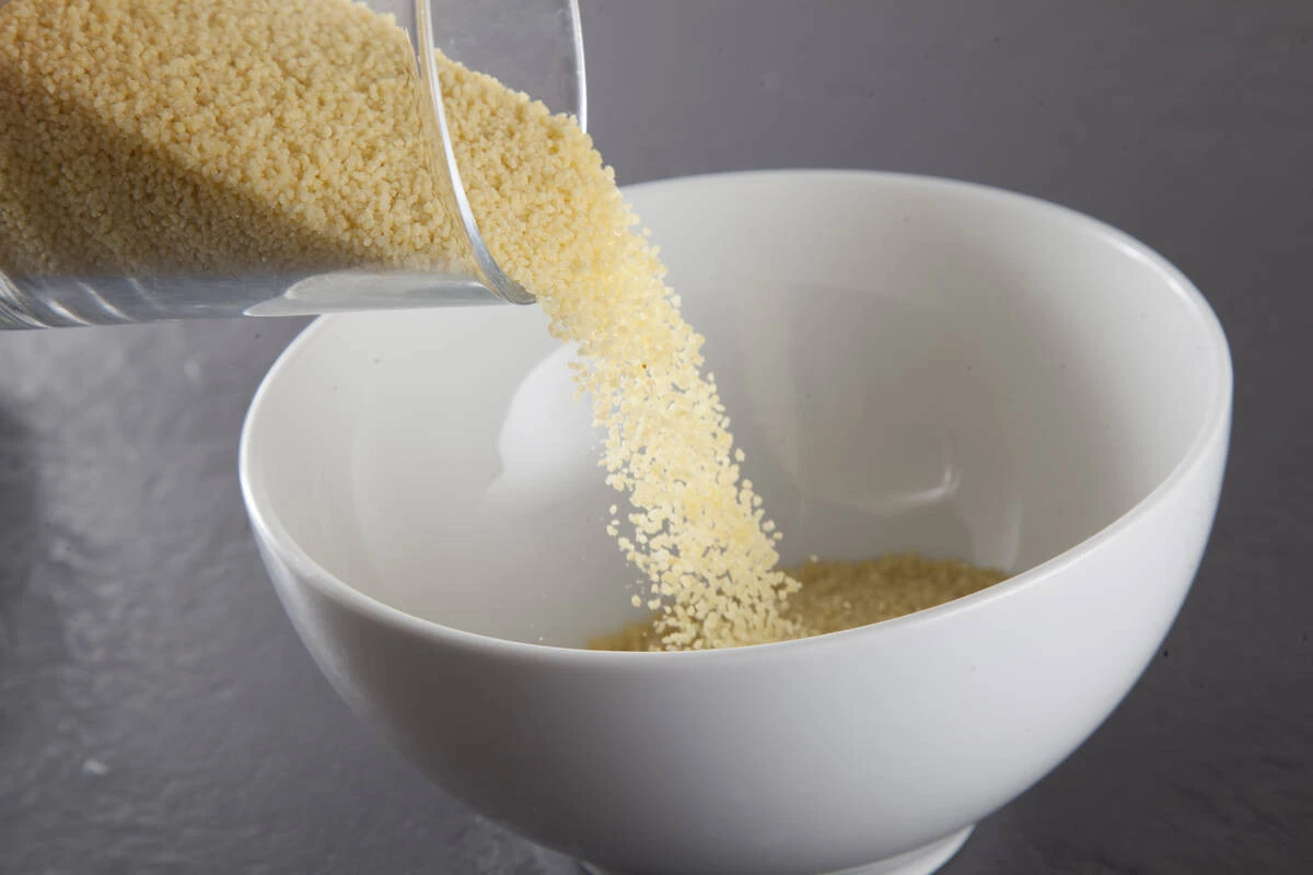 Кус-кус залейте вдвое большим количеством кипятка и накройте крышкой, в распаренную крупу добавьте немного оливкового масла и соль, взрыхлите вилкой. Кус-кус вкуснее свежеприготовленным, поэтому, готовьте его столько, сколько съедите за один раз.