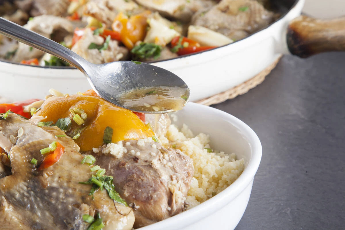 Очень яркое и ароматное блюдо в марокканском стиле - спелые летние овощи, нежное мясо цесарки в пряном соусе и рассыпчатый кус-кус. Отлично подойдет как в качестве праздничного блюда, так и в качестве простого обеда. Цесарку можно заменить вкусной курицей. Для этого блюда вам понадобится глубокая сковорода с толстыми стенками и дном, также подойдет небольшой казан, идеальной посудой конечно же будет тажин, но и в сковороде получается отлично!