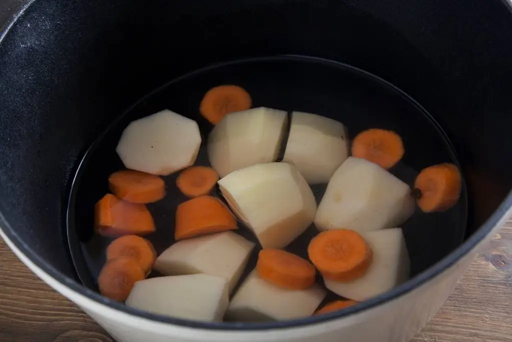 Картофель и морковь очистите, нарежьте крупно, залейте двумя стаканами холодной воды, добавьте перец-горошек и варите до мягкости картофеля.