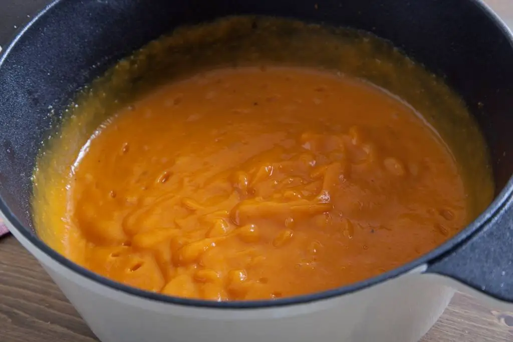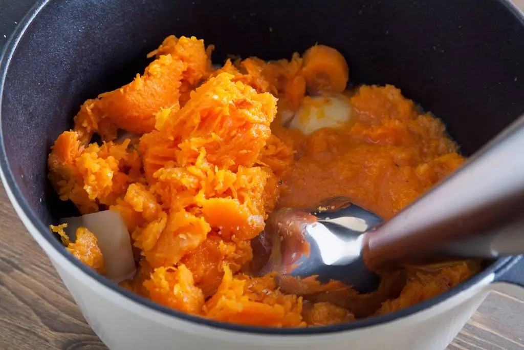 Готовую тыкву очистите от кожуры, добавьте к остальным овощам (горошинки перца выньте), также положите очищенную дольку чеснока, соль, мускатный орех и измельчите все в блендере до однородной массы.
