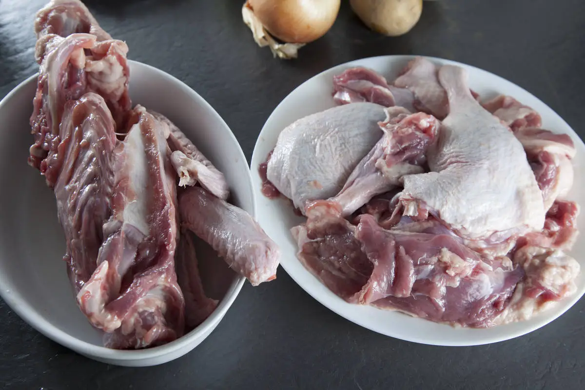 Утку разделайте – отделите окорочка, крылья, снимите мясо с грудки и спины, а каркас и последние фаланги крыльев оставьте для бульона. Мясо выложите на сухую сковороду кожей вниз и готовьте на слабом огне, когда вытопится жир, прибавьте нагрев, обжарьте куски до румяной корочки и выложите на тарелку.