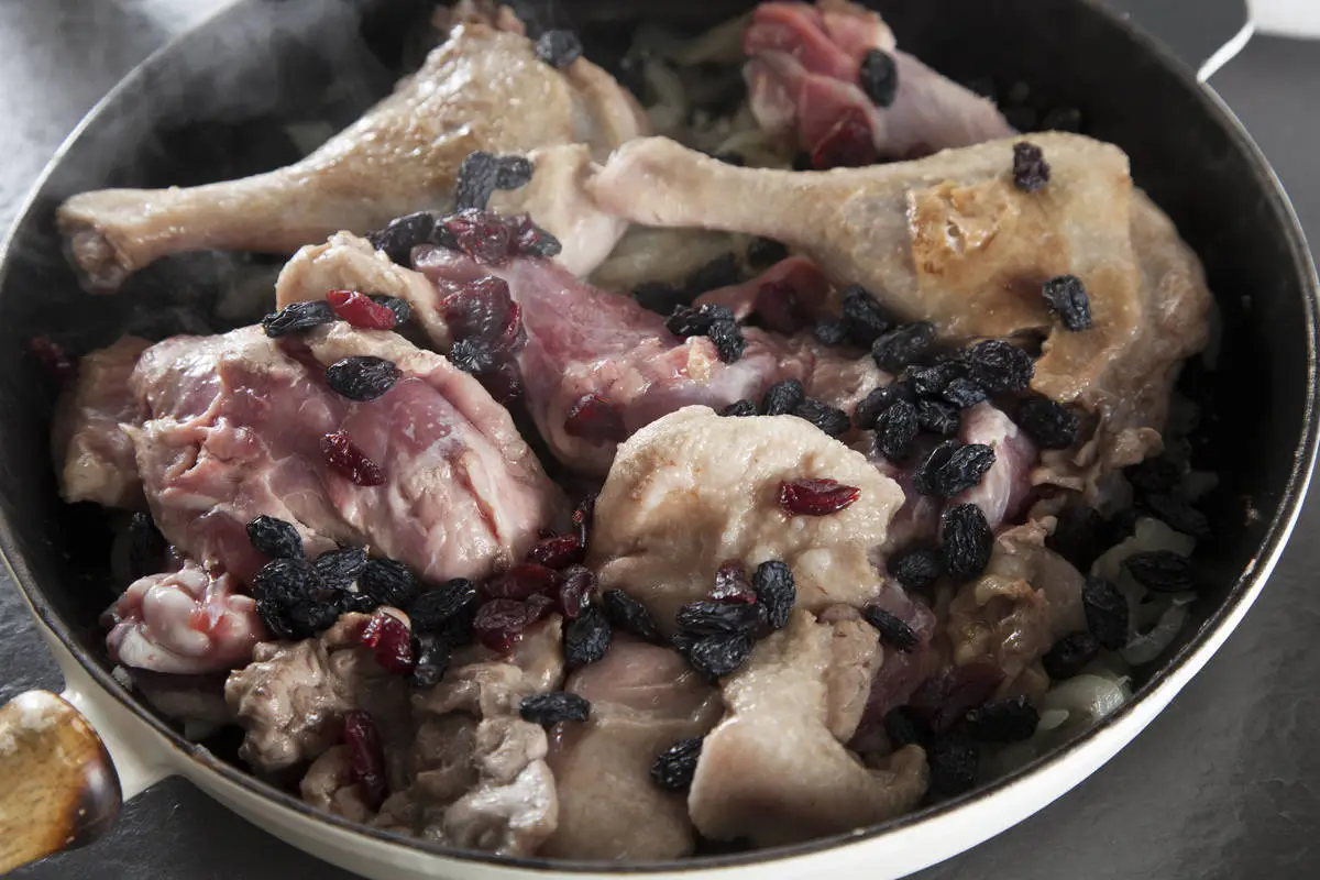 Луковицу нарежьте полукольцами, обжарьте до прозрачности в оставшемся от утки жире, верните мясо в сковороду, добавьте бруснику, промойте клюкву и изюм, посолите, влейте 100 мл воды, накройте сковороду крышкой и готовьте около часа.