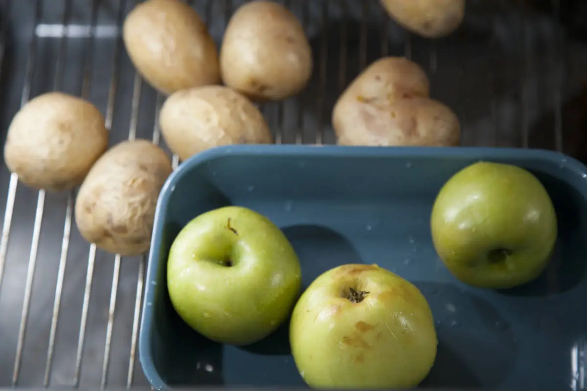 Картофель и яблоки помойте и запеките в духовке до готовности (можно приготовить на пару).