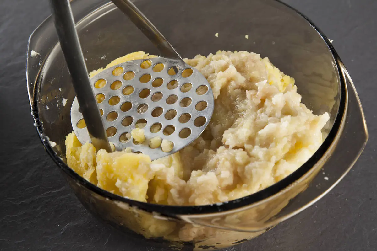 Дайте картошке и яблокам остыть, очистите от кожуры и растолките в пюре при помощи толкушки, можно добавить немного жидкости из сковородки с уткой, посолите по вкусу.