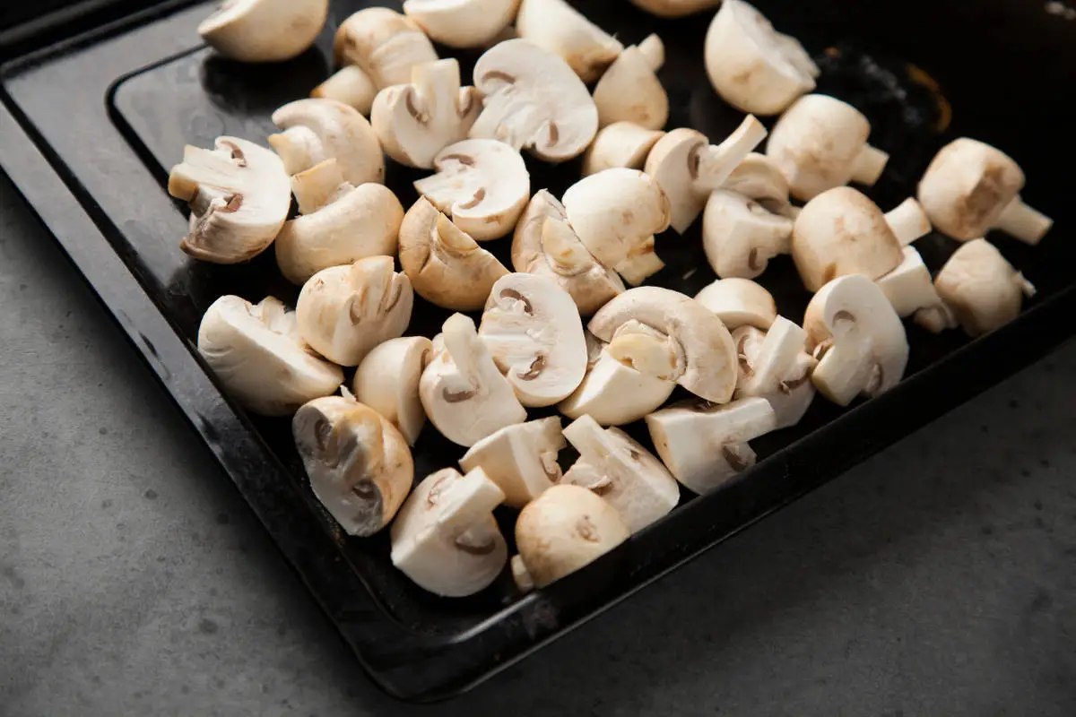 Разогрейте духовку до 180 °C. Шампиньоны нарежьте половинками, выложите на противень, сбрызните оливковым маслом и поставьте в горячую духовку на 5-10 минут.